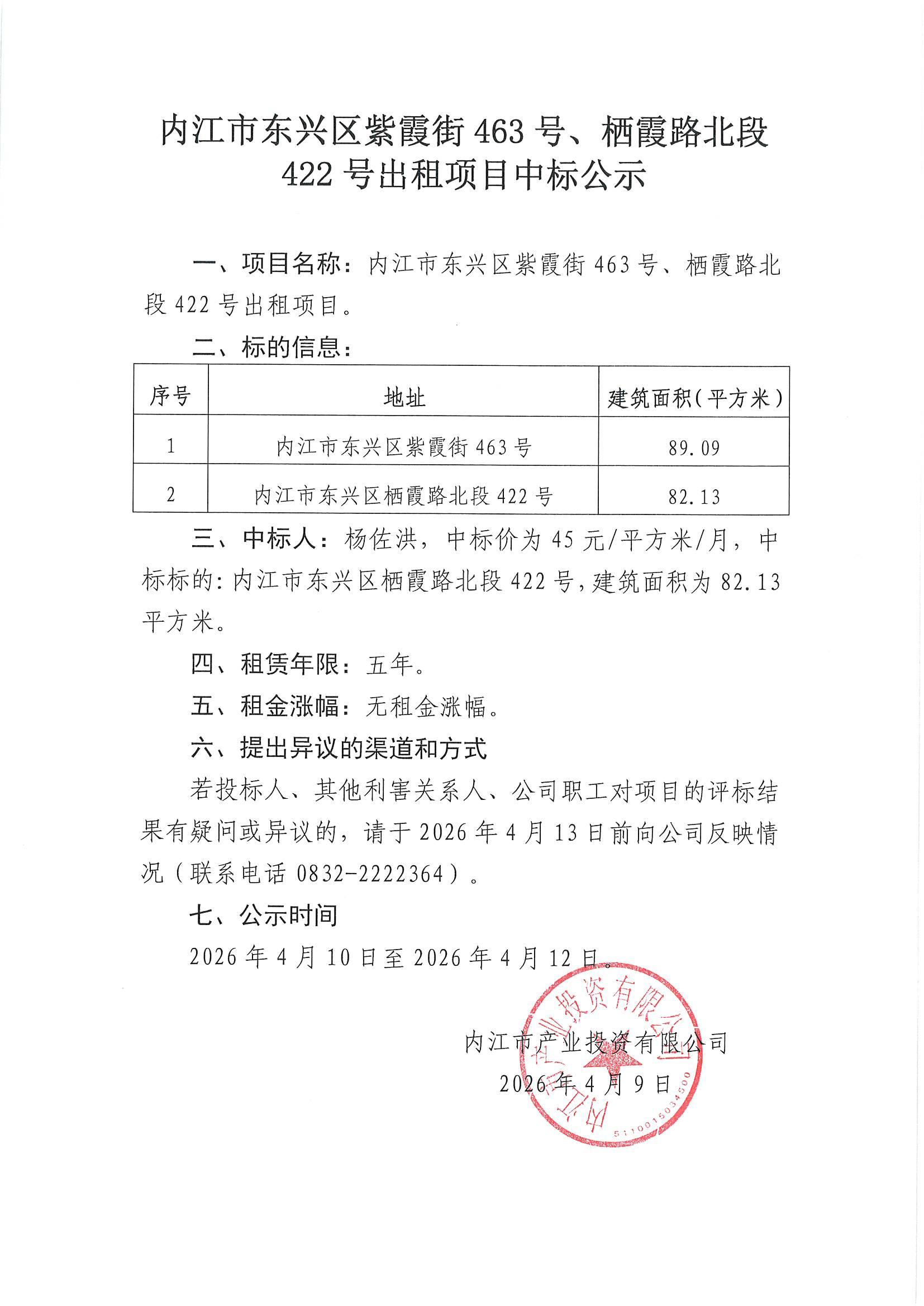 内江市东兴区紫霞街463号、栖霞路北段422号招租中标公示